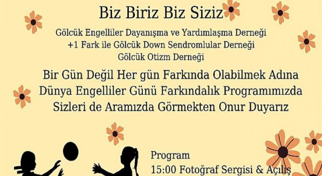Gölcük Engelliler Dayanışma ve Yardımlaşma Derneği, +1 Fark ile Gölcük Down Sendromlular Derneği ve Gölcük Otizm Derneği, Gölcük Belediyesi’nin desteği ile Dünya Engelliler Günü’ne özel farkındalık programı düzenleyecek. 2 Aralık 2022 Cuma günü Kazıklı Kervansarayı Kültür Yapısı’nda düzenlenecek programda özel bireyler tarafından hazırlanan fotoğraf sergisi ve mini konser ile konuklar keyifli anlar yaşayacak.