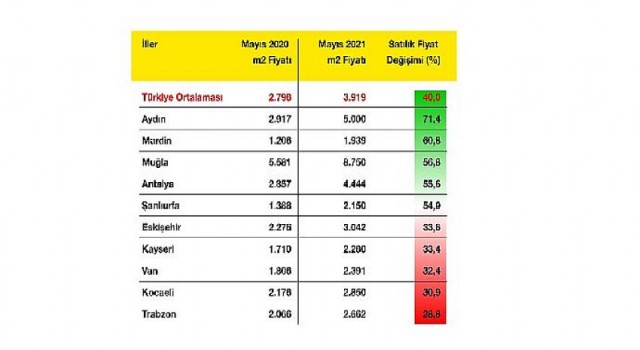 İlan satış fiyatlarının 2021 Mayıs ayında da geçen yılın aynı dönemine göre bütün büyükşehirlerde arttığı görülüyor (Tablo 1). Bununla birlikte fiyat artış oranları büyük farklılıklar gösteriyor. Satılık konut m² fiyatlarında en hızlı artışın görüldüğü iller yüzde 71,4 ile Aydın, yüzde 60,8 ile Mardin, yüzde 56,8 ile Muğla, yüzde 55,6 ile Antalya ve yüzde 54,9 ile Şanlıurfa olurken, olurken, en düşük artış hızının görüldüğü iller Eskişehir (yüzde 33,6), Kayseri (yüzde 33,4), Van (yüzde 32,4), Kocaeli (yüzde 30,9) ve Trabzon (yüzde 28,8) oldu.