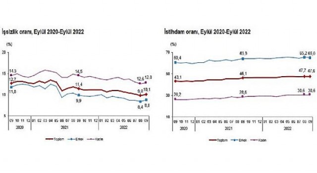 İstihdam edilenlerin sayısı 2022 yılı Eylül ayında bir önceki aya göre 54 bin kişi azalarak 30 milyon 867 bin kişi, istihdam oranı ise 0,1 puanlık azalış ile 47,6 oldu. Bu oran erkeklerde 65,0 iken kadınlarda 30,6 olarak gerçekleşti.