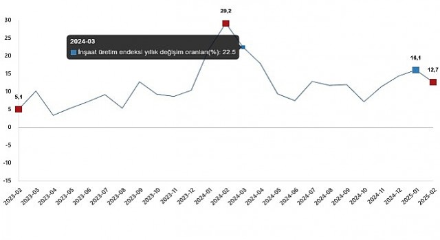 İnşaat üretim endeksi yıllık değişim oranları(%), Şubat 2025