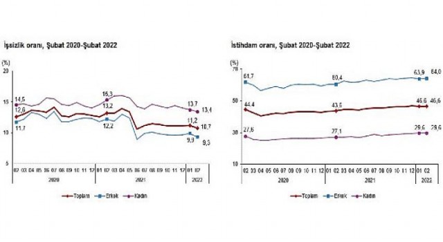 Zamana bağlı eksik istihdam, potansiyel işgücü ve işsizlerden oluşan atıl işgücü oranı 2022 yılı Şubat ayında bir önceki aya göre 0,9 puan azalarak 21,8 oldu. Zamana bağlı eksik istihdam ve işsizlerin bütünleşik oranı 14,7 iken potansiyel işgücü ve işsizlerin bütünleşik oranı 18,1 olarak tahmin edildi.