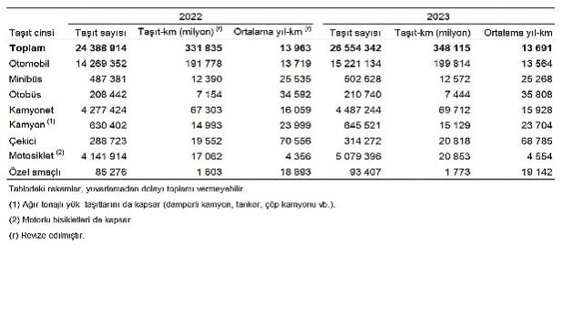 Taşıtların bir yılda yaptıkları ortalama kilometreler incelendiğinde; 2023 yılında sırasıyla çekicilerin 68 bin 785, otobüslerin 35 bin 808, minibüslerin 25 bin 268, kamyonların 23 bin 704, özel amaçlı taşıtların 19 bin 142, kamyonetlerin 15 bin 928, otomobillerin 13 bin 564 ve motosikletlerin 4 bin 554 kilometre yaptığı hesaplandı.
