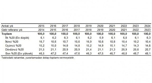 Son yapılan araştırma sonuçlarına göre; en yüksek eşdeğer hanehalkı kullanılabilir fert gelirine sahip %20'lik grubun toplam gelirden aldığı pay bir önceki yıla göre 0,6 puan azalarak %48,1 olurken en düşük gelire sahip %20'lik grubun aldığı pay ise 0,2 puan artarak %6,3 oldu.
