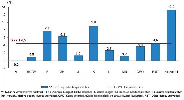 GSYH'yi oluşturan faaliyetler incelendiğinde; 2023 yılında bir önceki yıla göre zincirlenmiş hacim endeksi olarak; finans ve sigorta faaliyetleri toplam katma değeri %9,0, inşaat %7,8, hizmetler %6,4, diğer hizmet faaliyetleri %4,6, kamu yönetimi, eğitim, insan sağlığı ve sosyal hizmet faaliyetleri %3,8, gayrimenkul faaliyetleri %2,7, bilgi ve iletişim faaliyetleri %1,3, mesleki, idari ve destek hizmet faaliyetleri %1,2 ve sanayi %0,8 arttı. Tarım sektörü ise %0,2 azaldı.