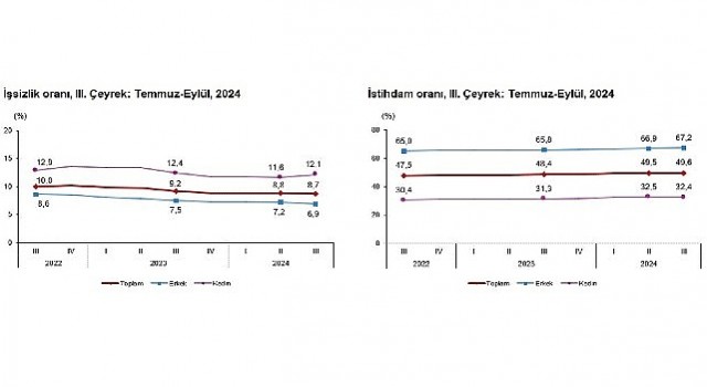 İstihdam edilenlerin sayısı 2024 yılı III. çeyreğinde bir önceki çeyreğe göre 136 bin kişi artarak 32 milyon 734 bin kişi, istihdam oranı ise 0,1 puanlık artış ile %49,6 oldu. Bu oran erkeklerde %67,2 iken kadınlarda %32,4 olarak gerçekleşti.