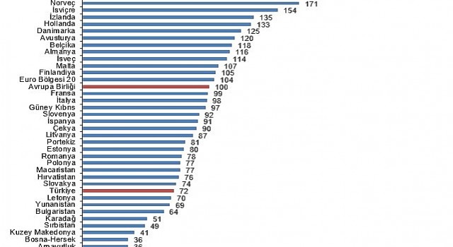 Kişi başına fiili bireysel tüketim düzeyi 27 Avrupa Birliği ülkesi ortalaması 100 iken, Türkiye için 84 oldu ve AB ortalamasının %16 altında kaldı. Karşılaştırmalarda yer alan 36 ülke arasında kişi başına fiili bireysel tüketim değeri en yüksek ülke 136 ile Lüksemburg, en düşük ülke ise 41 ile Arnavutluk oldu.