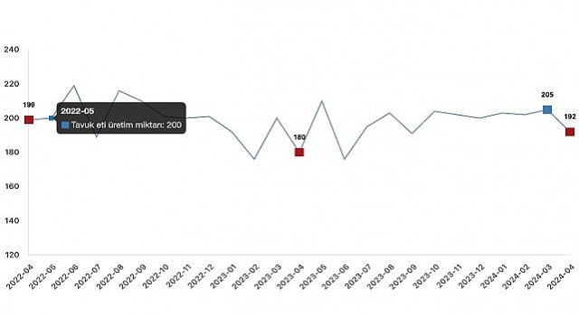 Bir önceki ay 204 bin 912 ton olan tavuk eti üretimi Nisan ayında %6,1 oranında azalarak 192 bin 386 ton oldu.
