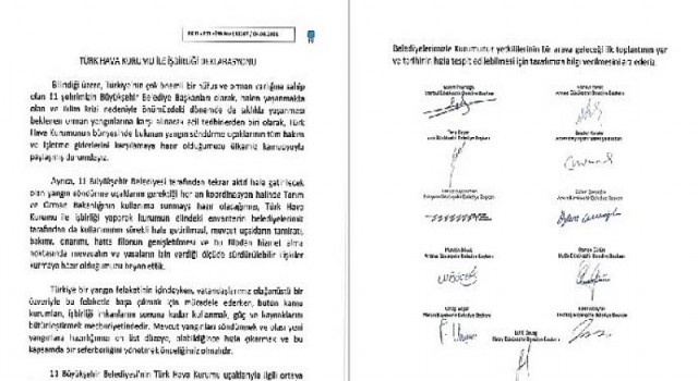 Deklarasyonla ayrıca, 11 Büyükşehir Belediyesi tarafından tekrar aktif hale getirilecek olan yangın söndürme uçaklarını gerektiği her an koordinasyon halinde Tarım ve Orman Bakanlığının kullanıma sunmaya hazır olacağımızı, Türk Hava Kurumu ile işbirliği yaparak kurumun elindeki envanterin Belediyelerimiz tarafından da kullanımının sürekli hale getirilmesi, mevcut uçakların tamiratı, bakımı, onarımı, hatta filonun genişletilmesi ve bu filodan hizmet alma noktasında mevzuatın ve yasaların izin verdiği ölçüde sürdürülebilir ilişkiler kurmaya hazır olduğumuzu beyan ettik.