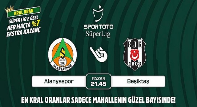 Süper Ligi’in ikinci haftasında Pazar günü saat 21:45’te oynanacak Alanyaspor-Beşiktaş maçının Kral Oranlar’ı belli oldu. Alanyaspor’un galibiyetine 2,68, Beşiktaş’ın galibiyetine 2,22 oran verildi. Mücadelenin berabere bitmesinin oranı ise 3,35 olarak belirlendi.