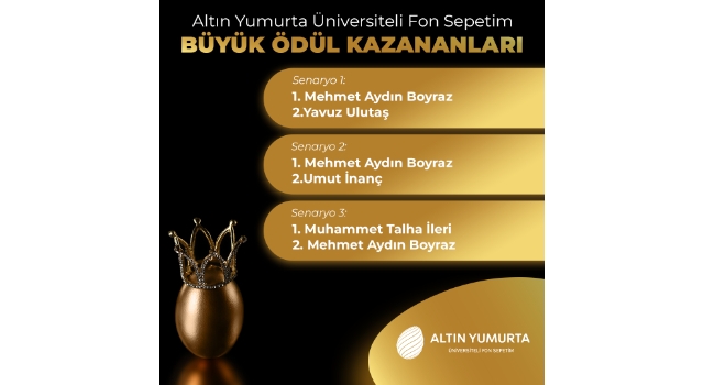 “Altın Yumurta Üniversiteli Fon Sepetim Yarışması” ile üniversite öğrencileri sanal ortamda oluşturulan portföylerini yönetti. Üç farklı kategoride ve 1 milyon TL tutarındaki sanal bütçe ile gerçekleşen yarışmada her ayın en iyi portföy getirisini sağlayan yarışmacılar nakit para ödülü kazanırken, yarışmanın büyük ödülünü ise yarışmada ilk iki dereceye giren öğrenciler “yatırım fonu” olarak aldı. Her kategorinin birincileri 10’ar bin TL, ikincileri de 7’şer bin TL karşılığında yatırım fonu almaya hak kazandı. Yarışmanın sonunda portföyünü en iyi yöneten öğrenciler toplam 66 bin TL tutarında ödülün sahibi oldu.