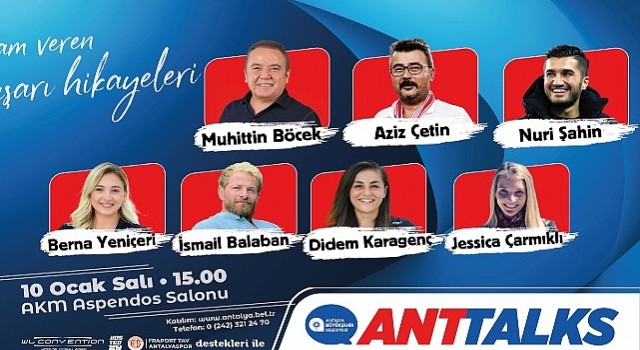 Antalya Büyükşehir Belediyesi, paylaşmaya değer fikirleri, yaşamları ve deneyimleri “ANTTALKS: İlham Veren Başarı Hikayeleri” etkinliğiyle Antalyalılarla buluşturacak. Etkinliğin ilki Antalyaspor iş birliğiyle 10 Ocak Salı günü saat 15.00’te Atatürk Kültür Merkezi’nde yapılacak.