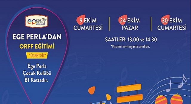 9 Ekim Cumartesi, 24 Ekim Pazar ve 30 Ekim Cumartesi günleri, B1 katında bulunan Ege Perla Çocuk Kulübü’nde düzenlenecek ücretsiz Orff eğitiminde; keşfederek öğrenme, doğaçlama ve ders konusunun canlandırmalarla işlenmesi yoluyla, çocukların kendilerini dil, müzik ve dansla ifade etmeleri teşvik edilecek.