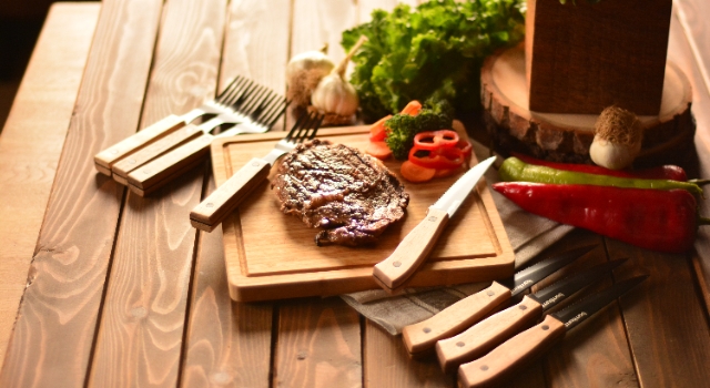 Döküm tavada, fırında veya mangalda pişirilen etlerin keyfine varmak sunum alternatifleriyle daha çekici bir hal alıyor. Klasik çatal ve bıçak takımlarıyla büyük bir eziyete dönüşen et yemekleri Bambum Pitera Steak seti ile büyük kolaylık sunuyor.