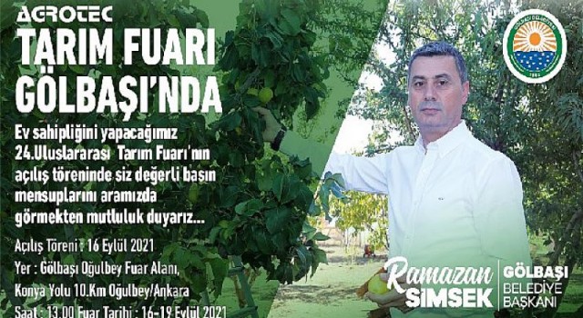 Tarım Sektörü 16-19 Eylül’de AGROTEC 2021 24. Uluslararası Tarım Fuarı’nda buluşacak. Tarım fuarına ev sahipliği yapacak olan Gölbaşı Belediye Başkanı Ramazan Şimşek “Fuar vesilesiyle 60 bin kişinin Gölbaşı’na gelmesini hedefliyoruz” dedi.