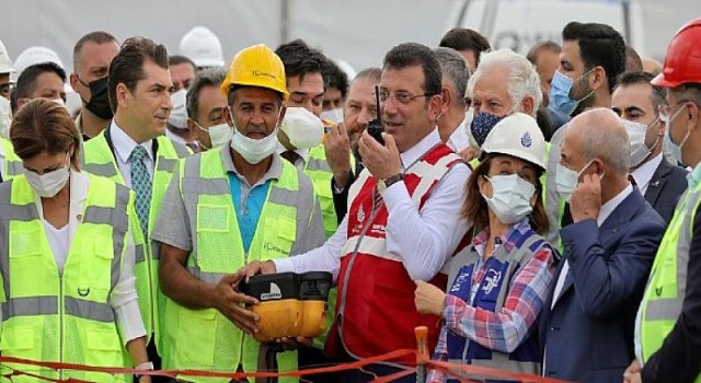 Konuşmaların ardından, İmamoğlu ve diğer protokol metronun inşaatına ilk harcı dökmek için inşaat