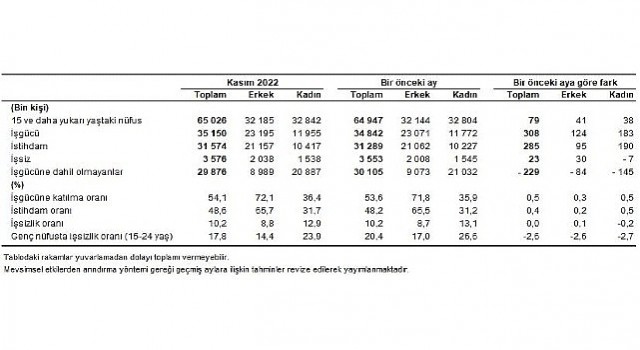 Hanehalkı İşgücü Araştırması sonuçlarına göre; 15 ve daha yukarı yaştaki kişilerde işsiz sayısı 2022 yılı Kasım ayında bir önceki aya göre 23 bin kişi artarak 3 milyon 576 bin kişi oldu. İşsizlik oranı ise değişim göstermeyerek %10,2 seviyesinde gerçekleşti. İşsizlik oranı erkeklerde %8,8 iken kadınlarda %12,9 olarak tahmin edildi.