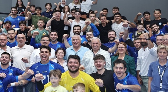 Maç sonunda hentbolcuları kutlayan Nilüfer Belediye Başkanı Şadi Özdemir, galibiyet sevincini takımla paylaştı.