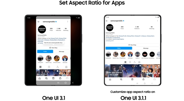 Özelleştirilebilir en boy oranlarıyla katlanabilir akıllı telefonun Sonsuz Esnek Ekranından en iyi şekilde faydalanmak mümkün. Sosyal medyada gezildiğinde ve her iki taraftaki siyah alanlar olmaksızın tam ekrana geçmek istenildiğinde kullanılan uygulamanın boyutu sabit kalabiliyor. One UI 3.1.1 sayesinde artık uygulama boyutu da değiştirilebiliyor. Bu sayede kullanıcılar arkadaşlarının fotoğraf ve videolarını dikkat dağıtıcı unsurlar olmadan tam ekranda görüntüleyebiliyor. Samsung'un geniş katlanabilir ekranlarından en iyi şekilde yararlanmak için bu özelliği “Labs” üzerinden etkinleştirmek yeterli. Bunun için Labs'e gidin > Özelleştirilmiş Uygulama En Boy Oranları'na tıklayın > En boy oranlarını özelleştirmek için uygulamalara tıklayın > Tam ekran, 16:9, 4:3 ya da Uygulama varsayılanı olmak üzere dört seçenekten birini seçin.