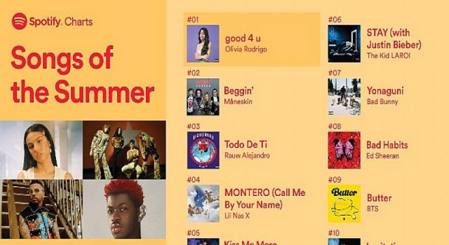 2021 yazında Spotify’da en çok dinlenen şarkı, 29 Mayıs - 22 Ağustos tarihleri arasında dünya genelinde 600 milyondan fazla dinlenmeyle Olivia Rodrigo’dan “good 4 u” oldu. “good 4 u”, 14 Mayıs tarihinde yayınlandığından beri 18 milyondan fazla çalma listesine eklendi. 2021 yazına dünya genelinde damgasını vuran “good 4 u” aynı zamanda, 325,000’den fazla çalma listesinin adında yer aldı.