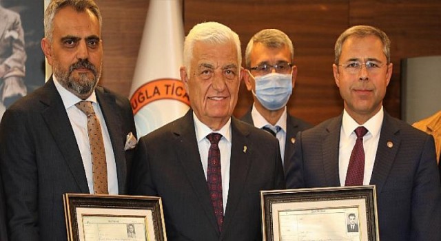 Muğla Ticaret ve Sanayi Odası Yönetim Kurulu Başkanı Mustafa Ercan ve Meclis Başkanı Koray Özcan, Muğla Büyükşehir Belediye Başkanı Dr. Osman Gürün’e 1943 yılında tütün ticareti yapan babası Şahi Gürün’ün sicil defterinin kopyasını hediye etti.