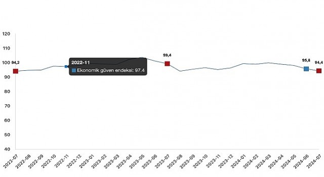 Bir önceki aya göre Temmuz ayında tüketici güven endeksi %3,1 oranında azalarak 75,9 değerini, reel kesim (imalat sanayi) güven endeksi %1,8 oranında azalarak 98,7 değerini, hizmet sektörü güven endeksi %1,1 oranında azalarak 114,1 değerini, perakende ticaret sektörü güven endeksi %1,5 oranında azalarak 107,1 değerini, inşaat sektörü güven endeksi %0,9 oranında azalarak 87,1 değerini aldı.