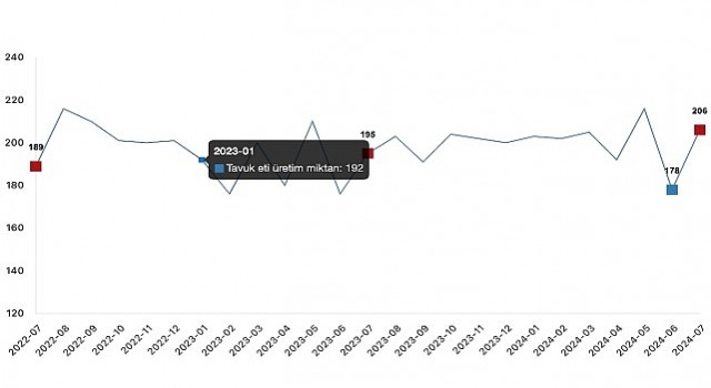 Bir önceki ay 177 bin 740 ton olan tavuk eti üretimi Temmuz ayında %15,7 oranında artarak 205 bin 656 ton oldu.