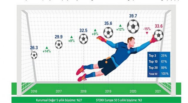 Futbolda şampiyonluk kupaları sahiplerini bulurken KPMG Football Benchmark ekibi Avrupa'da geride kalan sezonu analiz etti. KPMG'nin her yıl hazırladığı 'Avrupa Eliti' araştırmasının son raporunda Avrupa futbolunun en değerli 32 takımı belirlendi. Son beş yılda yüzde 44 değer kazanan 32 kulüp, Covid-19 nedeniyle son bir yılda yüzde 15 değer kaybetti. Geçen yıla göre kulüplerin toplam değeri 6 milyar 100 milyon euro kayıpla 33 milyar 600 milyon euro olarak belirlendi.
