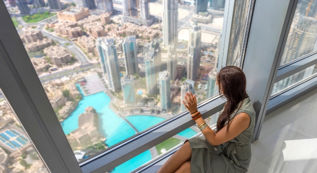 Emaar Sky View Hotel'de Manzara Seyir Terası: Yolcular cam tabanlı geçit üzerinde cesaret isteyen bir yürüyüş yaparak (skywalk), bu adrenalin dolu aktivite sırasında Dubai'yi gökyüzünden bakarak izleyebilirler.